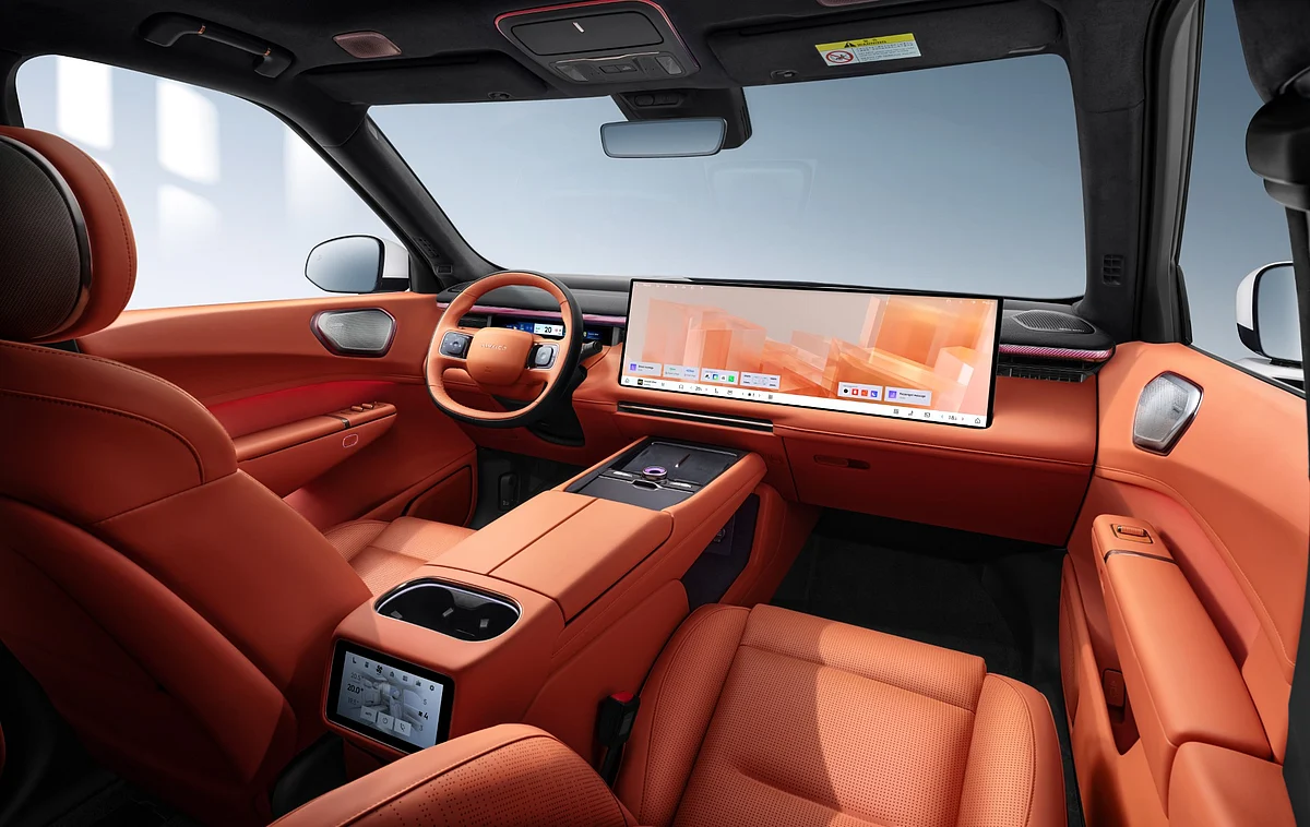The Lynk & Co 900 is a 6-seater SUV. It features three rows with captain seats and has an ultra-luxurious cabin layout. The dashboard gets a double-decker design with a full-width 95-inch augmented reality HUD, a 12.33-inch digital console, and a twin 30-inch 6K screen setup that acts as an infotainment screen.
